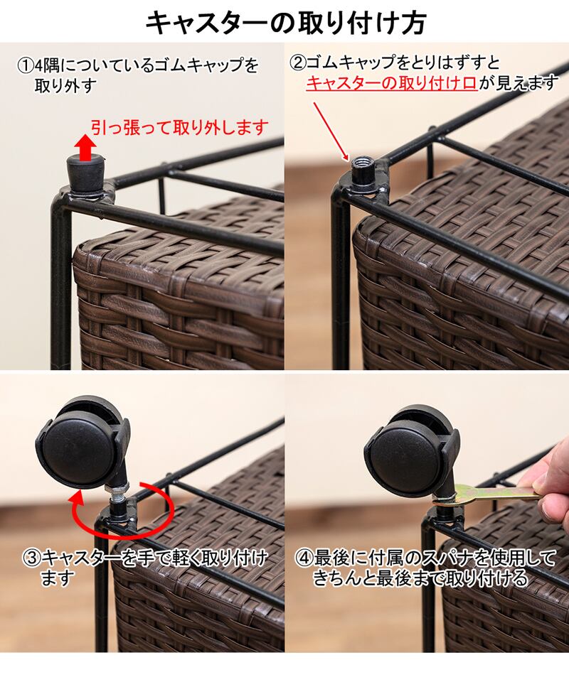 組立式(約10分(キャスター取り付けのみ)/付属の工具にて取付け)1個口