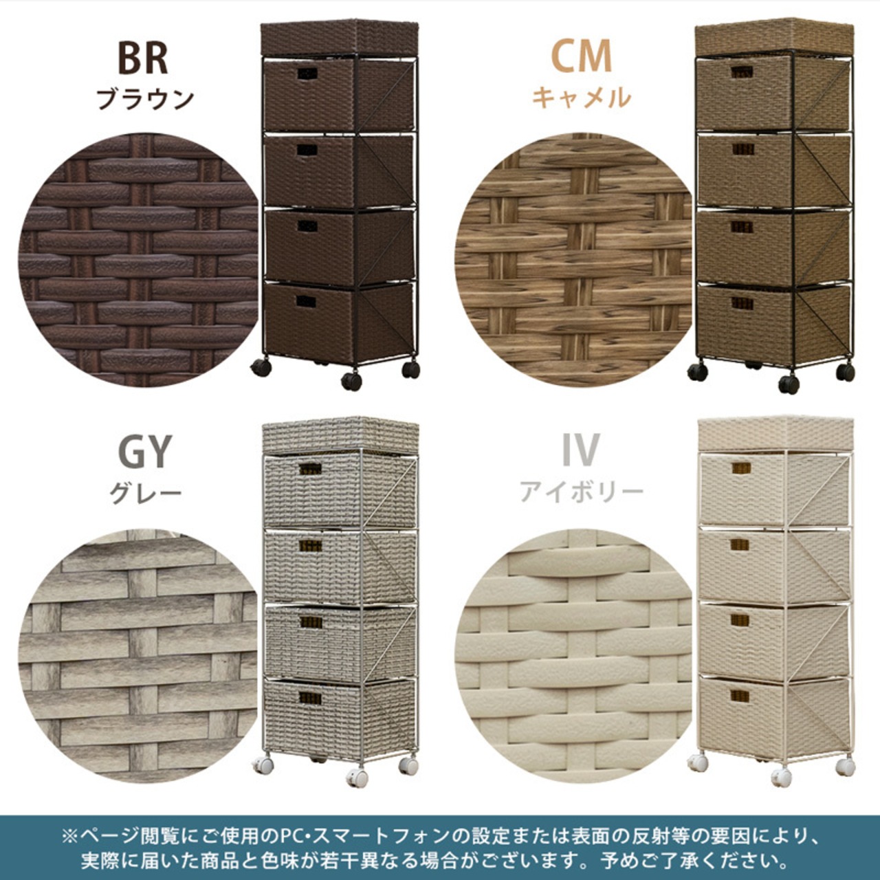 ブラウン(BR)、アイボリー(IV)、キャメル(CM)、グレー(GY)の4色展開です