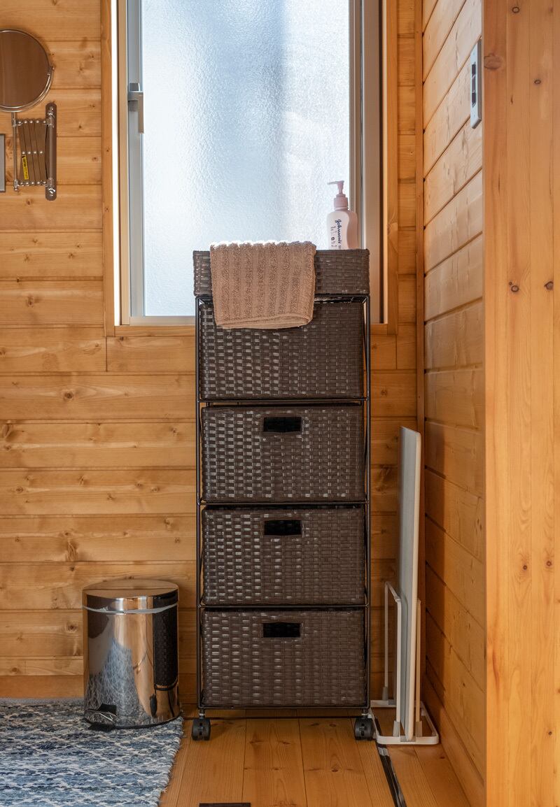 水や汚れに強い人工ラタンのカゴは通気性にも優れているため、タオルや着替えの収納に役立ちます