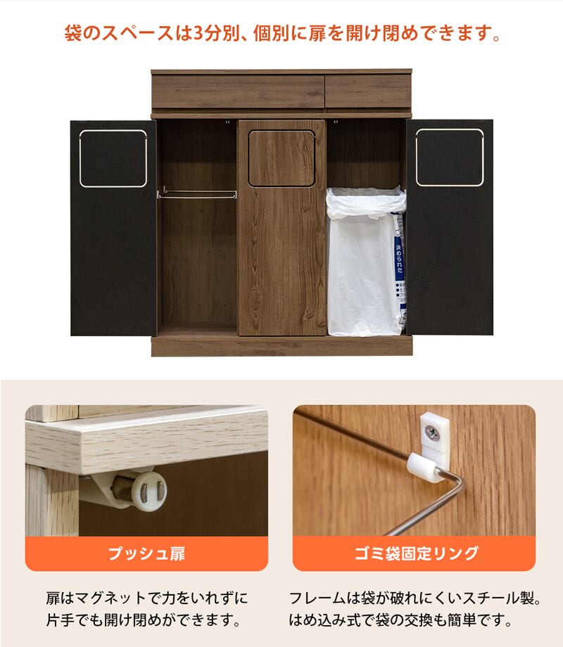ゴミ袋は、それぞれ3か所セット出来て、中のリングにセットするだけ簡単構造です